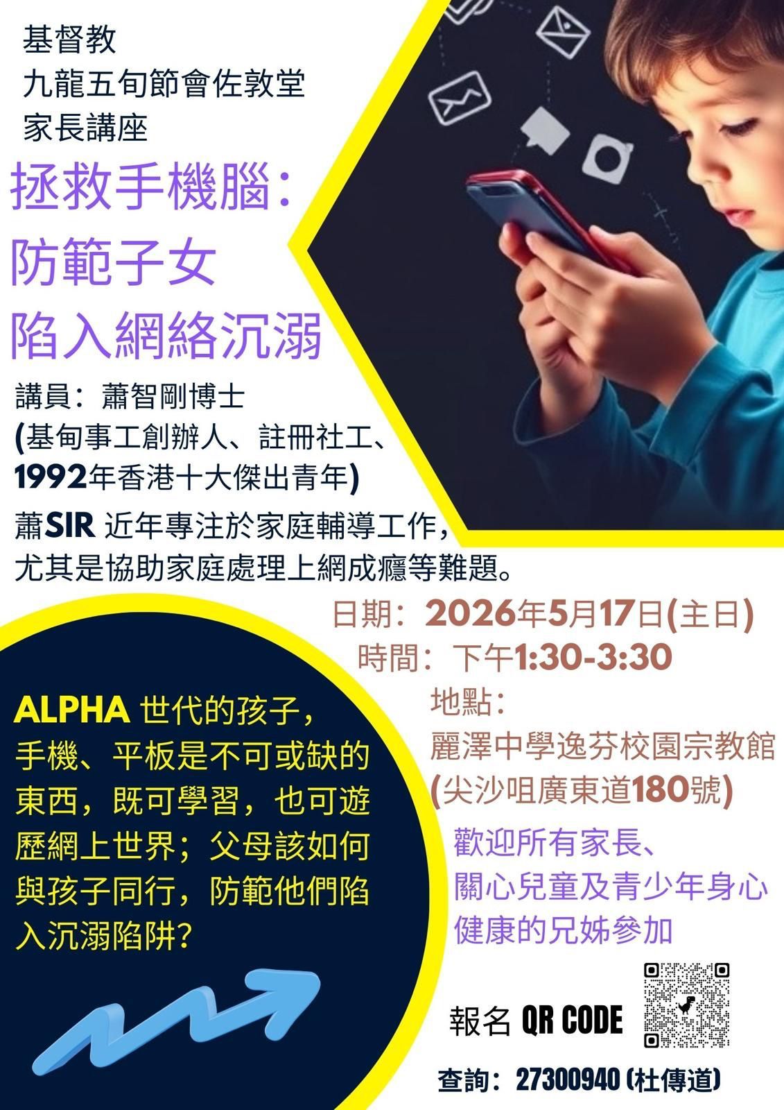 - 面對網絡使用的普及,我們如何防範自己及子女跌落網絡沉溺?假如你願意與我們一起學習和Alpha世代同行,請報名參加5月17日下午1時30分至3時30分假麗澤中學宗教館舉行的「拯救手機腦:防範子女陷入網絡沉溺」家長講座。可經二維碼報名,查詢請與杜傳道聯絡。