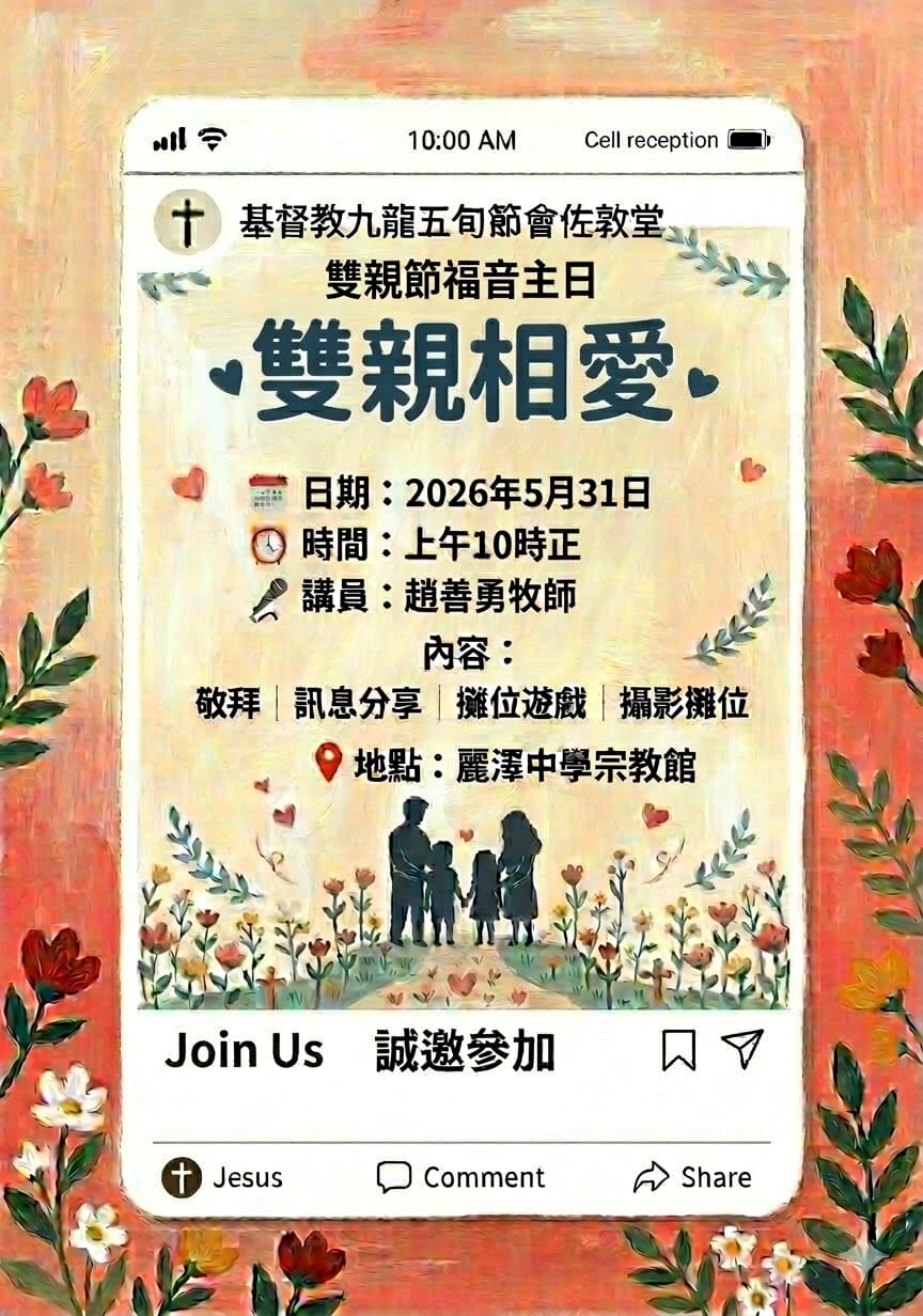- 「雙親相愛」雙親節福音主日定於5月31日上午10時假麗澤中學宗教館舉行,講員為趙善勇牧師,除敬拜及福音信息外,更設有攤位遊戲及家庭照拍攝攤位。鼓勵弟兄姊妹踴躍邀請父母、親人及朋友出席(詳情參活動海報),並為此福音主日禱告。